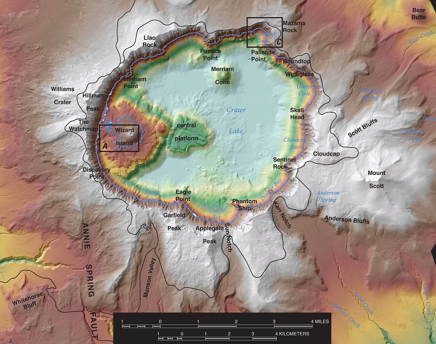 Die folgende Abbildung ist eine kombinierte digitale Höhen- und bathymetrische Karte des Crater Lake (Oregon). Der Crater Lake befindet sich in der Caldera des Mount Mazama, einem Vulkan der Kaskadenkette, der einst 3.700 m hoch war. Er brach vor ca. 7.700 Jahren aus, brach danach in sich zusammen und bildete die aktuelle Caldera. Diesem Ereignis ging eine 400.000 Jahre lange vulkanische Aktivität voraus, während der ein Kegel aufgebaut wurde. Auch heute ist die Region noch potentiell aktiv.