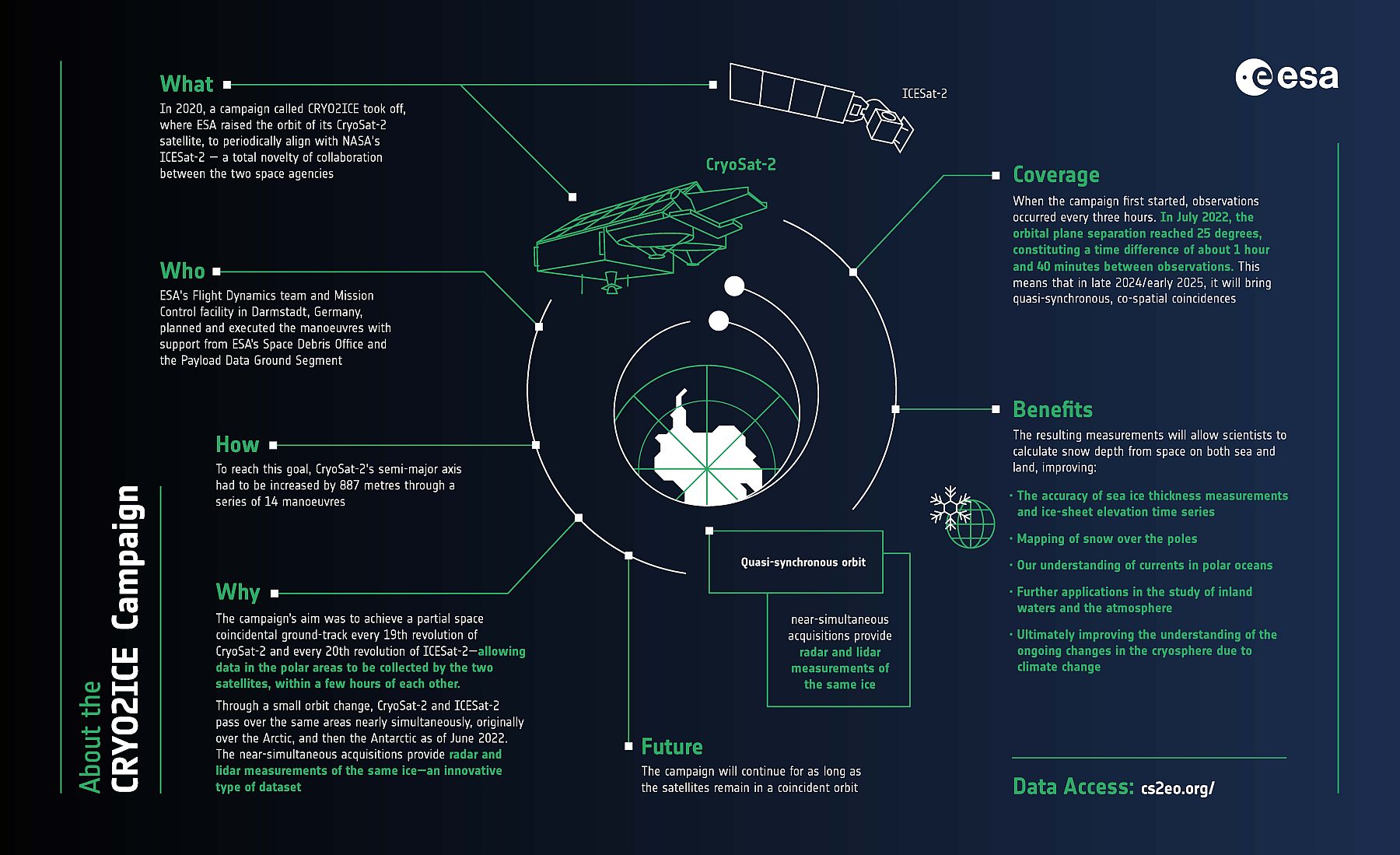 Durch eine kleine Änderung der Umlaufbahn überflogen CryoSat-2 und ICESat-2 fast gleichzeitig dieselben Gebiete und lieferten Radar- und Lidarmessungen desselben Eises. Die daraus resultierenden Messungen werden es den Wissenschaftlern ermöglichen, die Schneehöhe aus dem Weltraum sowohl auf dem Meer als auch auf dem Land zu berechnen und so die Genauigkeit der Messungen der Meereisdicke und der Zeitreihen über die Höhe des Eisschildes zu verbessern. Die neuen Daten werden auch dazu beitragen, den Schnee über den Polen zu kartieren und unser Verständnis der Strömungen in den polaren Ozeanen zu verbessern, und es wird erwartet, dass sie weitere Anwendungen bei der Untersuchung von Binnengewässern und der Atmosphäre finden werden.