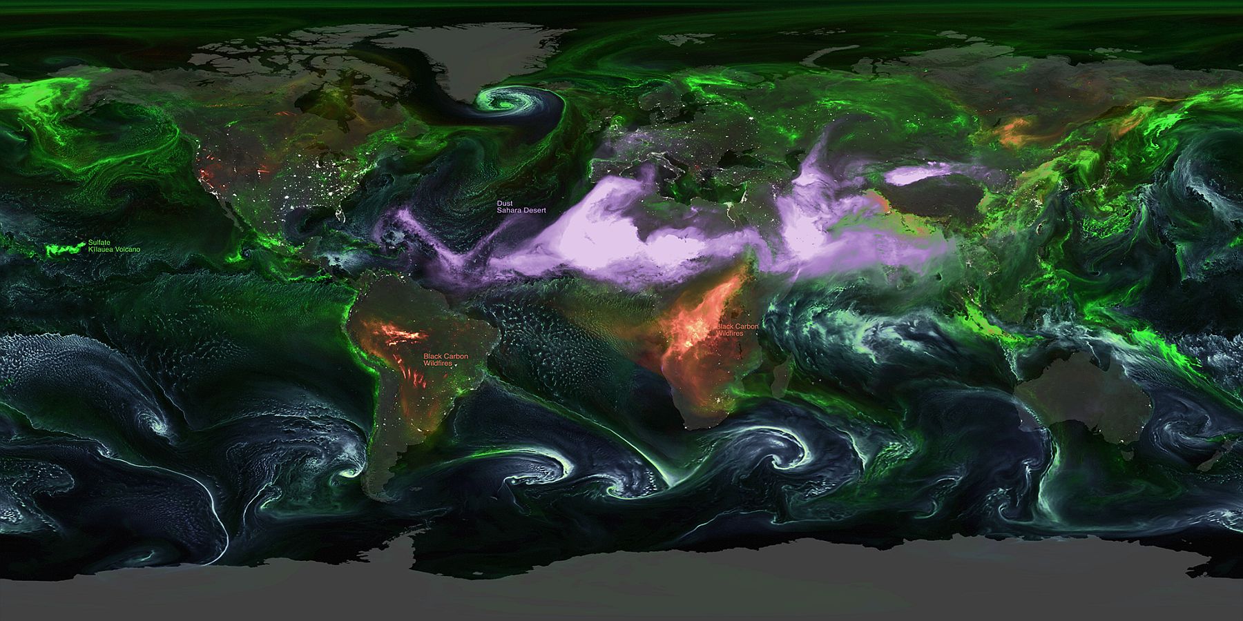 Aerosole in der Luft (äquirektanguläre Projektion) Über die folgende Quellenangabe sind unterschiedliche Animationen abrufbar. Quelle: NASA