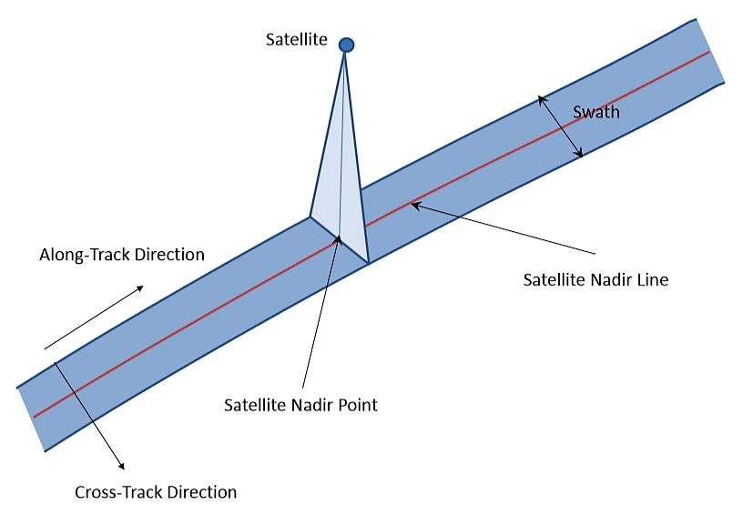 In der folgenden Darstellung befindet sich die Nadirlinie in der Mitte des Bildstreifens. Dies ist die häufigste Methode bei Aufnahmen im sichtbaren und infraroten Bereich. Daneben kann der Bildstreifen auch seitlich zur Nadirlinie verlaufen.