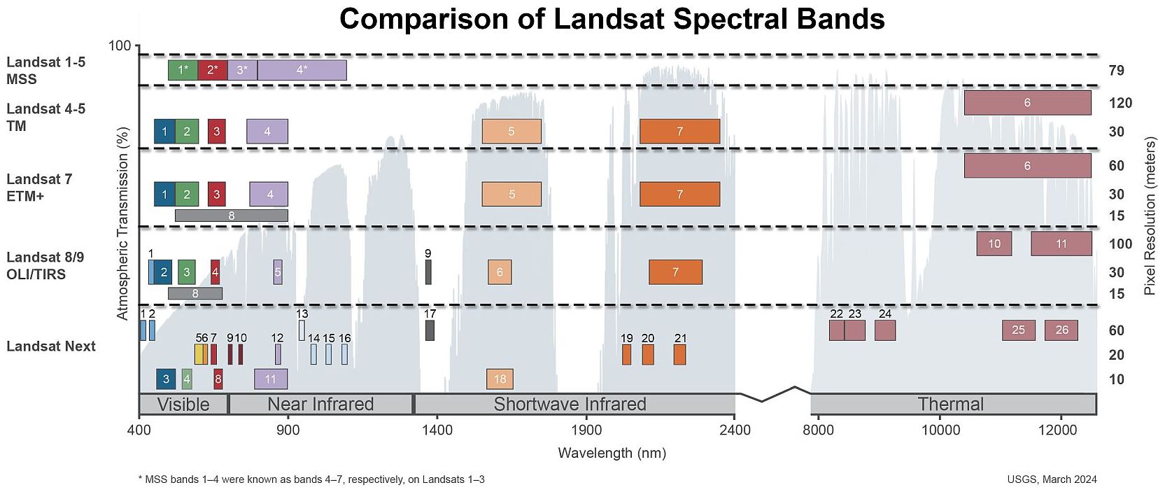 Das folgende Bild zeigt die spektralen Bandbreiten der Sensoren auf allen Landsat-Satelliten.