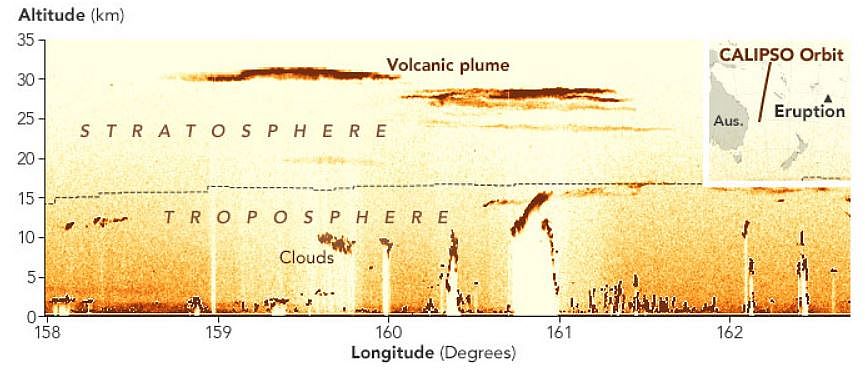 Das folgende Profilbild, das auf Daten basiert, die am 16. Januar von der Mission „Cloud-Aerosol Lidar and Infrared Pathfinder Satellite Observations“ (CALIPSO) gesammelt wurden, zeigt Material aus der Eruption, das bis zu einer Höhe von 31 Kilometern aufsteigt. Der Ausbruch war so stark, dass vulkanisches Material in die Stratosphäre gelangte, die in diesem Teil der Welt in der Regel in einer Höhe von über 15 Kilometern beginnt. Wissenschaftler beobachten genau, wann vulkanisches Material diese relativ trockene Schicht der Atmosphäre erreicht, da die Partikel dort viel länger verweilen und viel weiter wandern als in der unteren, feuchteren Troposphäre. Wenn genügend vulkanisches Material in die Stratosphäre gelangt, kann es einen kühlenden Einfluss auf die globalen Temperaturen ausüben. Andere CALIPSO-Daten, die am 15. Januar gesammelt wurden, deuten darauf hin, dass eine kleine Menge Asche und Gas möglicherweise eine Höhe von bis zu 39,7 Kilometern erreicht hat.