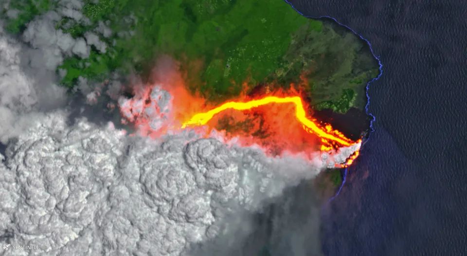 Die folgende Abbildung der Eruption des Kilauea und seiner Lavaströme am 12.6.2018 kombiniert Informationen aus dem sichtbaren und infraroten Spektrum von Sentinel-2B.