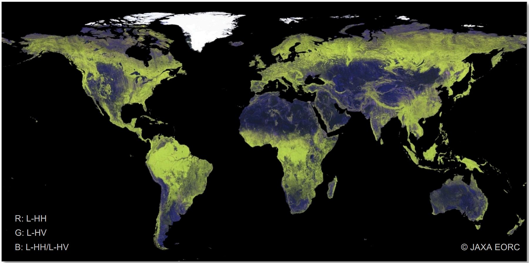 | Globales Mosaik von ALOS PALSAR mit einem Pixelabstand von 25 m (0,8 Bogensekunden). HH+HV-Polarisationskomposit. Quelle: eoPortal |