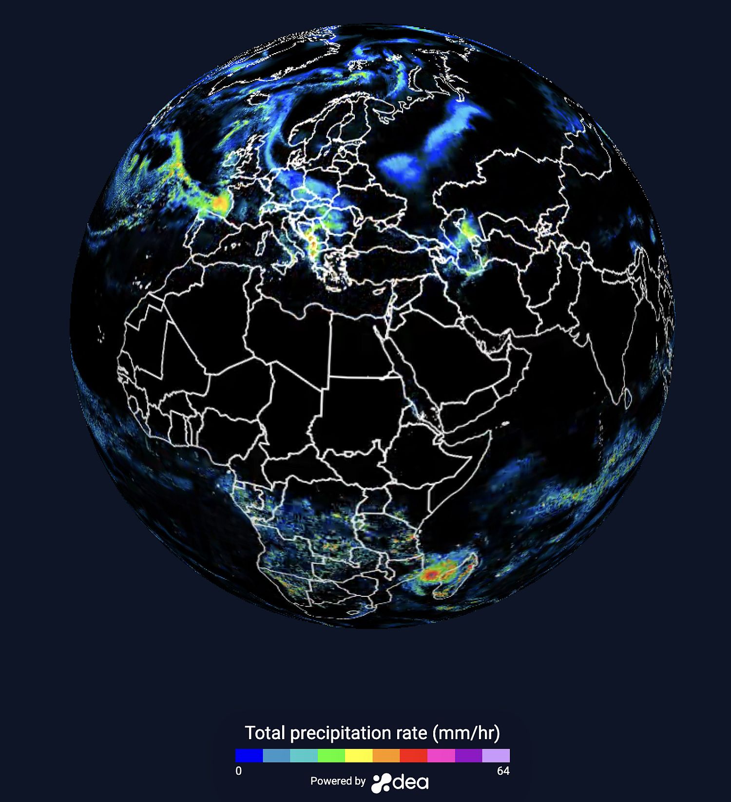 | Visualisierung von Daten aus digitalen Zwillingen: DestinE-Karte der Gesamtniederschlagsmenge für 1/2024 Quelle: eoPortal / Destination Earth |
