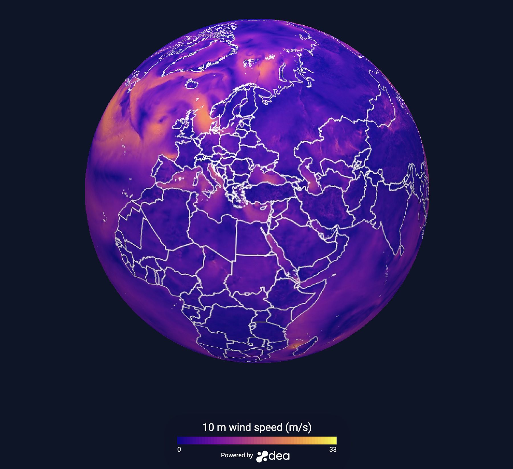 Windgeschwindigkeitskarte über 10 min von DestinE (1/2024) Quelle: eoPortal / Destination Earth |
