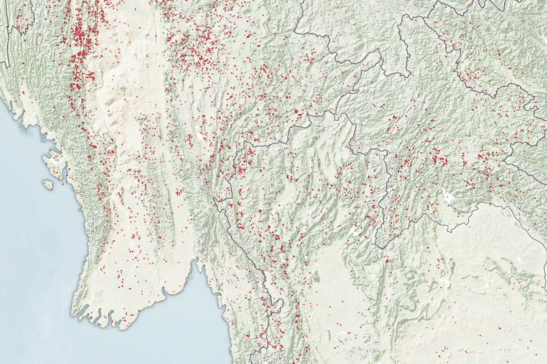 Jedes Jahr im Januar und Februar beginnen Satelliten, Rauch- und Feuerwellen in Südostasien zu erfassen, insbesondere in den Hochlandwäldern in Kambodscha, Laos, Myanmar und Thailand. Die Feueraktivität nimmt im März und April weiter zu, erreicht während der Trockenzeit ihren Höhepunkt und klingt dann im Mai mit Beginn der Regenzeit wieder ab.