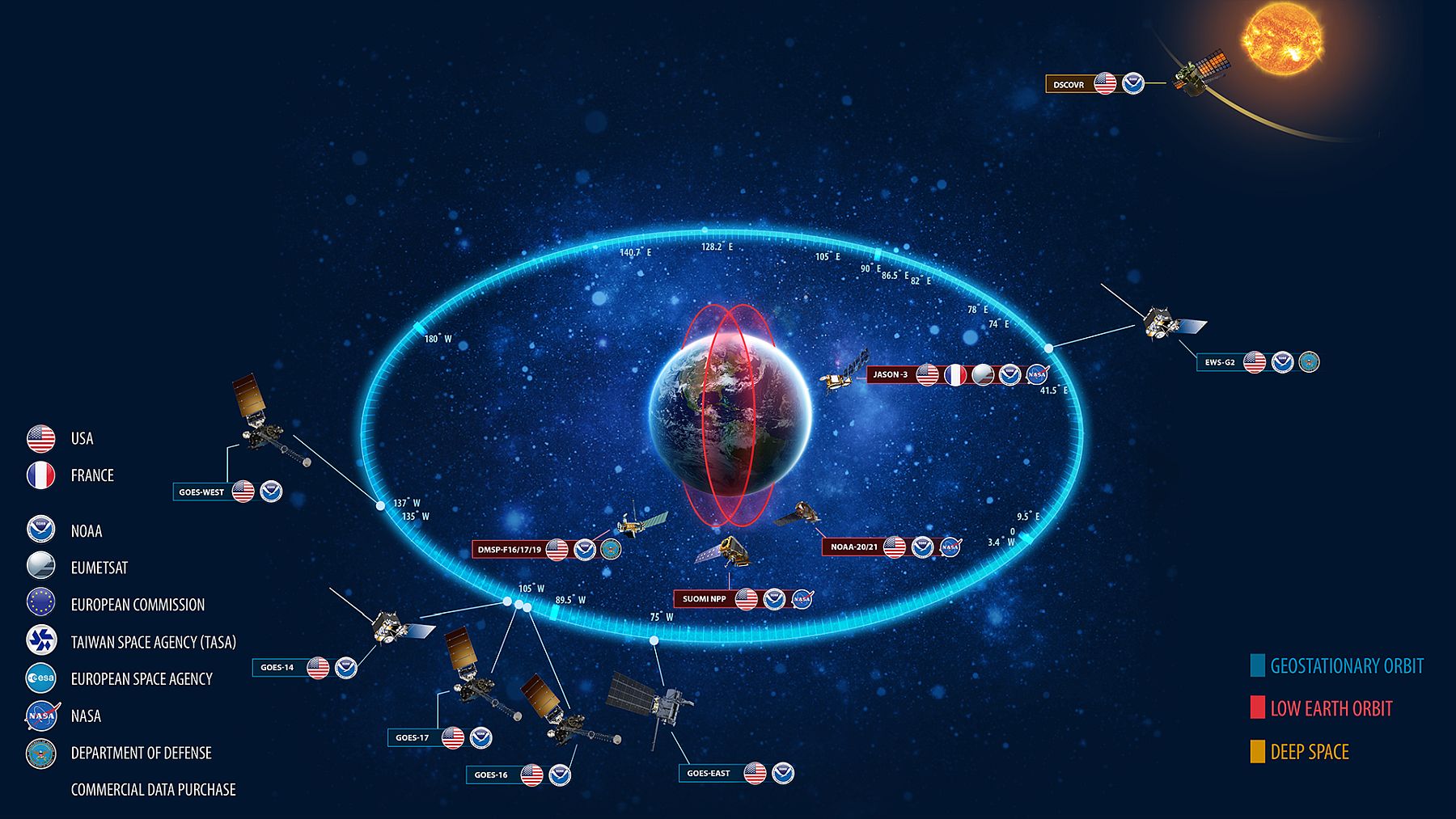 | Die 15 Satelliten der NOAA (2025) Die NOAA besitzt und betreibt acht Satelliten, darunter: