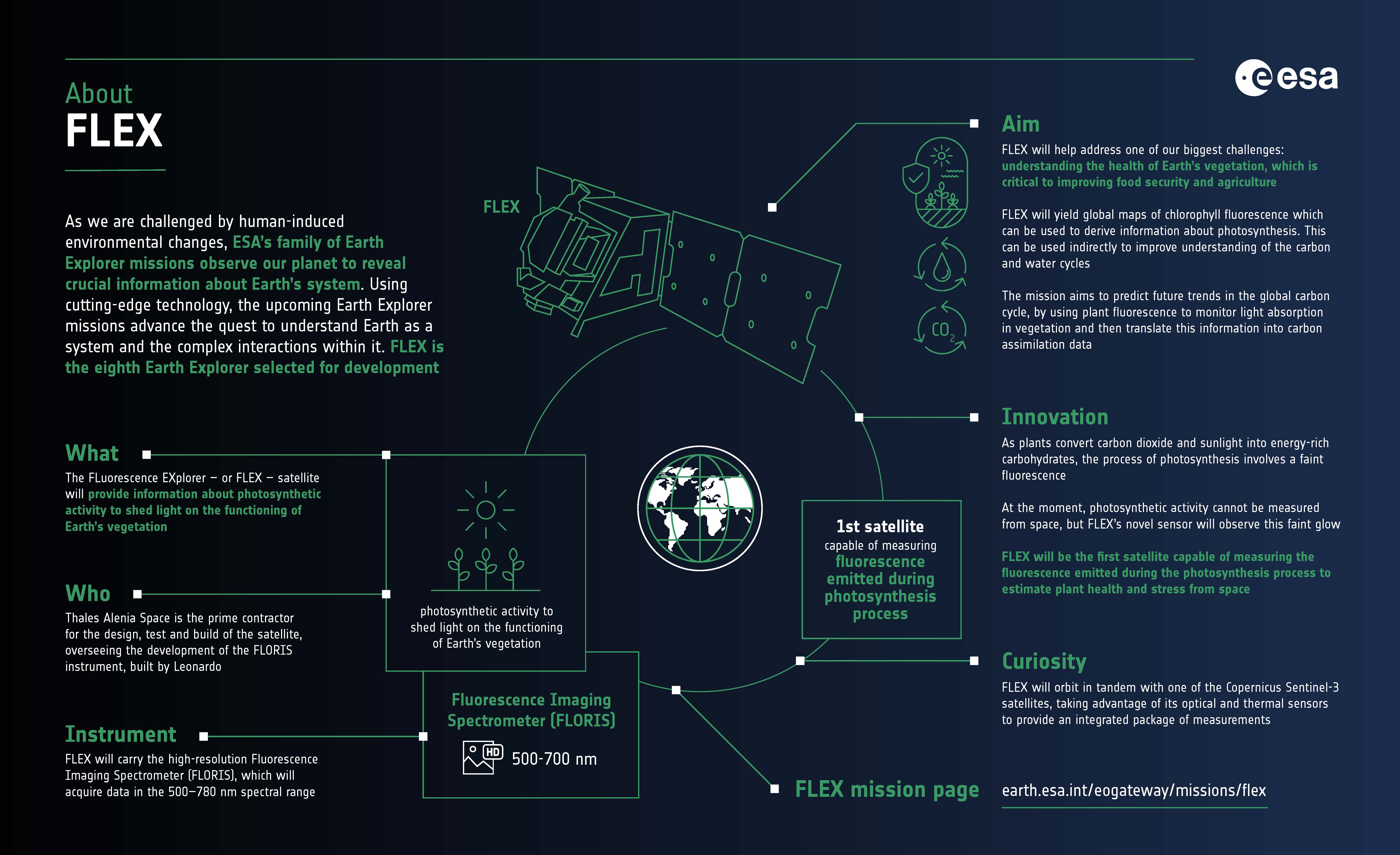 Derzeit kann Photosynthese noch nicht aus dem All gemessen werden – FLEX’ neuartiger Sensor wird jedoch in der Lage sein, dieses schwache Glimmen zu erfassen. Der FLEX-Satellit wird im Tandem mit einem der Sentinel-3 Satelliten des Copernicus-Programms die Erde umkreisen um mit den optischen und thermischen Sentinel-Sensoren ein umfassendes Paket an Messdaten zur Verfügung stellen zu können. FLEX wird neue Informationen über die effektive Produktivität von Vegetation liefern, die genutzt werden können, um das Agrarmanagement und die Entwicklung einer nachhaltigen Bio-Ökonomie zu unterstützen.