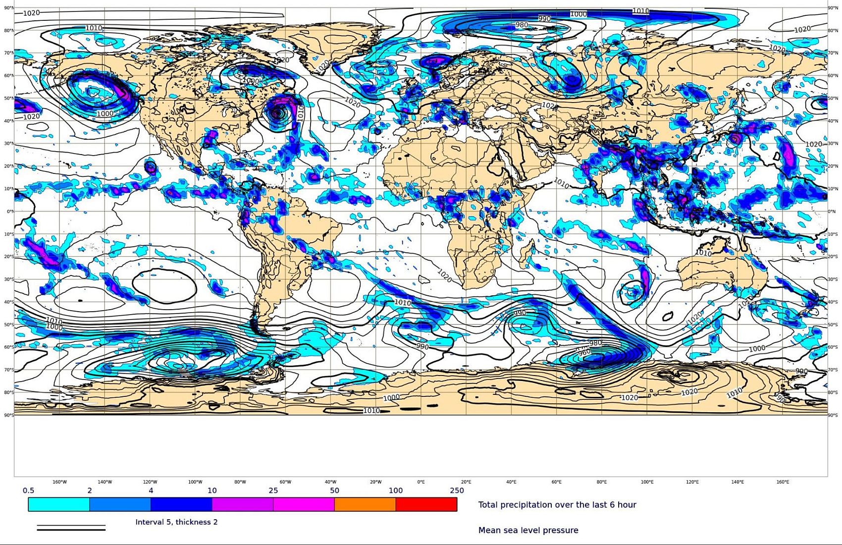 Globale Modelle wie das Integrierte Vorhersagesystem (IFS) des Europäischen Zentrums für mittelfristige Wettervorhersagen (ECMWF) und das Globale Vorhersagesystem (GFS) der Nationalen Zentren für Umweltvorhersagen (NCEP) sind NWP-Systeme, die die Atmosphäre über der gesamten Erde simulieren. Sie stützen sich in hohem Maße auf polarumlaufende Satelliten und In-situ-Datenquellen. Mikrowellen- und Infrarot-Sondierungsinstrumente von Satelliten werden in globalen Modellen verwendet, um die vertikale Struktur der atmosphärischen Temperatur und Feuchtigkeit abzuleiten, die für die Modellinitialisierung unerlässlich sind.