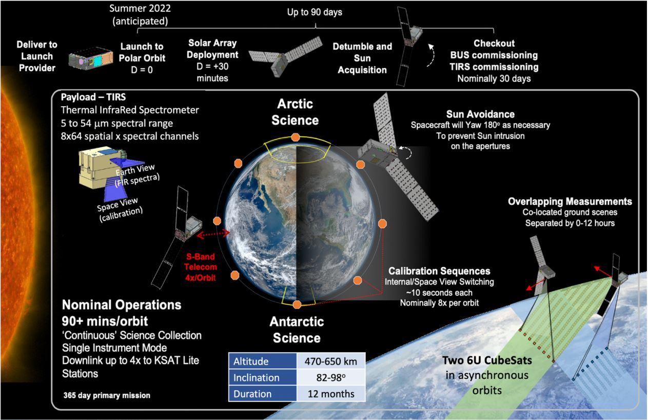 PREFIRE wird miniaturisierte thermische Infrarotspektrometer auf zwei CubeSat-Satelliten fliegen, die jeweils etwa die Größe eines Schukartons haben. Die Sensoren basieren auf einer Technologie, die zuvor auf dem Mars Climate Sounder geflogen wurde, einem Instrument auf dem Mars Reconnaissance Orbiter der NASA. Die CubeSats werden die Pole der Erde umkreisen, um Emissionen im fernen Infrarot (FIR) zu messen und festzustellen, wie sie sich im Laufe des Tages und der Jahreszeiten verändern. Die Beobachtungen werden es den Wissenschaftlern ermöglichen, zu beurteilen, wie Veränderungen der thermischen Infrarotemissionen an der Oberseite der Erdatmosphäre mit Veränderungen der Wolkenbedeckung und der Oberflächenbedingungen darunter zusammenhängen, wie z. B. der Menge an Meereis und Schmelzwasser an der Oberfläche des Eises.