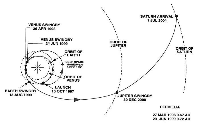 So wurde zum Beispiel die Sonde Cassini-Huygens auf dem Weg zum Saturn zuerst von der Venus auf die nötige Geschwindigkeit gebracht. Nach dem Start auf der Erde flog die ESA/NASA-Raumsonde Cassini-Huygens zweimal an der Venus und einmal an der Erde vorbei sowie einmal am Jupiter, bis sie durch diese Swing-by-Manöver genug kinetische Energie hat, ihr Ziel, den Saturn zu erreichen (vgl. Abb.).
