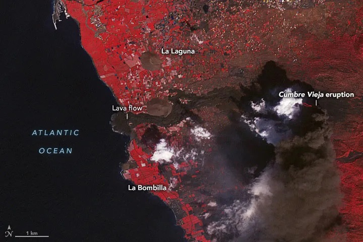 Am 4. Oktober um 13:40 Uhr westeuropäischer Zeit schoss ein Astronaut an Bord der Internationalen Raumstation (ISS) ein Foto (oben) vom südlichen Ende von La Palma. Der schräge Kamerawinkel bietet einen dreidimensionalen Blick darauf, wie die Vulkanwolke über die tief liegenden Wolken aufsteigt. Am späten Vormittag desselben Tages nahm das Advanced Spaceborne Thermal Emission and Reflection Radiometer (ASTER) auf dem Terra-Satelliten der NASA ein Falschfarbenkomposit (unten) der Eruption mit einer Kombination aus Infrarot-, Rot- und Grünwellenlängen auf. Auf dem Bild ist die Vegetation rot und die Lavaströme braun bis schwarz. (s.a. La Palma lava flows into the sea)