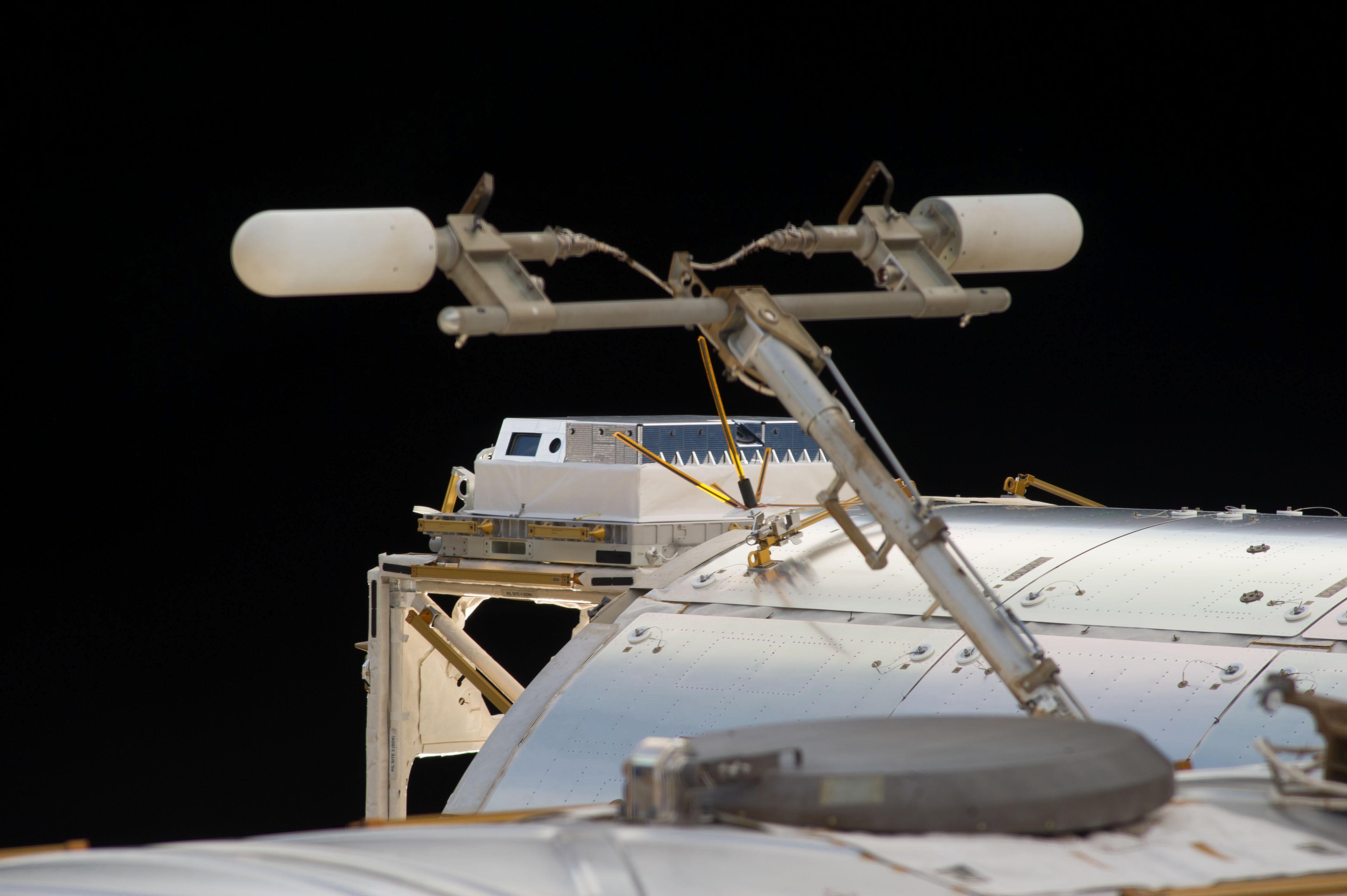 | High Definition Earth Viewing (HDEV) Box mit den vier COTS-Kameras (Hintergrund) an der Außenseite des europäischen Columbus-Raumlabors (runder Korpus) |