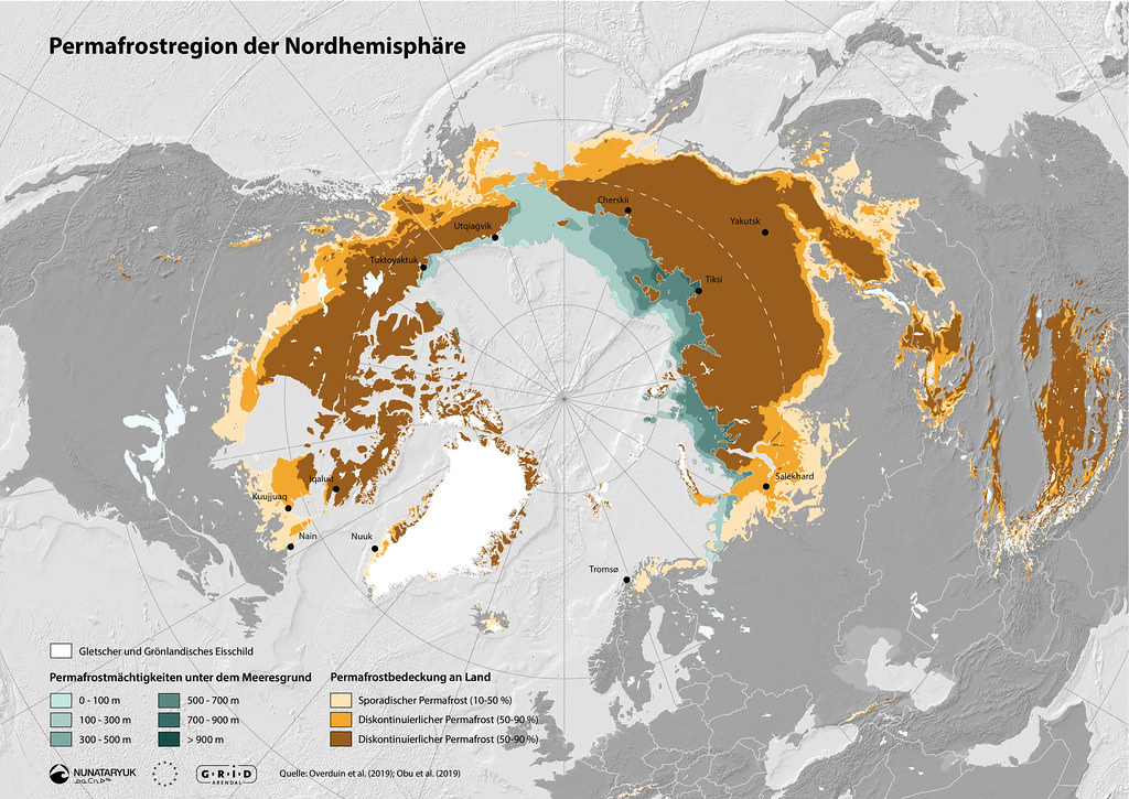 ![]() | Permafrost in der nördlichen Hemisphäre Der Permafrost taut auf und verändert sich schnell, was die arktische Region und den gesamten Planeten vor ernsthafte Herausforderungen stellt. Eine neue Karte, die im Rahmen des Nunataryuk-Projekts erstellt wurde, gibt ein aktuelles Bild der Ausdehnung des Permafrosts in der Arktis und den subarktischen Regionen, sowohl an Land als auch vor der Küste, und stellt eine wichtige Grundlage dar, von der aus Permafrostveränderungen in der Zukunft gemessen werden können. Diese neue Karte spiegelt ein verbessertes Verständnis der Ausdehnung des Permafrosts sowohl an Land als auch unter Wasser wider. Sie veranschaulicht, wie sich der terrestrische Permafrost unter dem Arktischen Ozean ausbreitet, insbesondere in Nordsibirien und Alaska. Etwa 10 Prozent der gesamten Permafrostfläche in der nördlichen Hemisphäre befindet sich unter dem Meeresboden, und seine Dicke variiert stark. Submariner Permafrost ist noch viel weniger erforscht als terrestrischer Permafrost, und weitere Forschung ist notwendig, um das Ausmaß und die Auswirkungen des auftauenden Permafrosts besser zu verstehen, insbesondere in den Küstenregionen der Arktis. Quelle: GRID Arendal 2021 |
