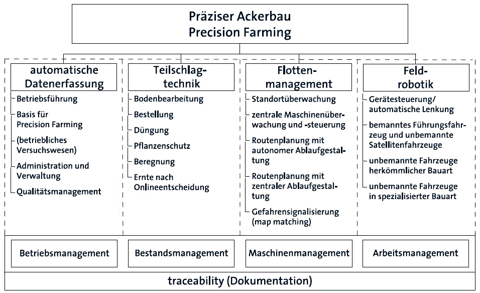 Gegenwärtig wird bereits intensiv modernste, z.T. berührungslose Sensorik an Bord landtechnischer Fahrzeuge so z.B. Bildsensoren (CCD-Sensor) zur Unkrauterkennung, Steuerungssensoren für Dünge- und Pflanzenschutzapplikation, Korndurchsatzmeßsensoren beim Mähdrusch usw. genutzt, die eine standortspezifische Düngezufuhr bzw. Ernteertragserhebung z.T. in Echtzeit ermöglichen. Die Kopplung mit Real-time-Kinematic-Differenzial-GPS-Empfängern (RTK-DGPS) erlaubt die exakte geodätische Positionierung des landwirtschaftlichen Sensors auf der Teilfläche. Genauigkeitsvorstellungen liegen üblicherweise im 1 m bis 5 m-Bereich.