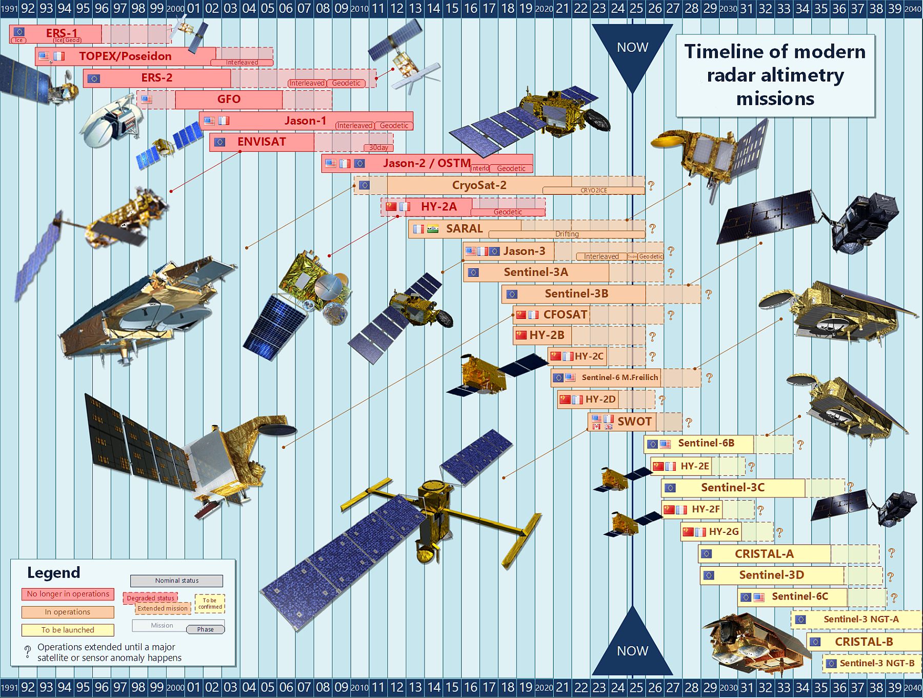 Das folgende Schaubild zeigt die Zeitachse moderner Radaraltimeter von den neunziger Jahren bis zum nächsten Jahrzehnt, einschließlich der erwarteten oder angekündigten Missionsverlängerungen über die nominelle Lebensdauer der Satelliten hinaus. Vergangene Missionen sind in rot dargestellt. In Betrieb befindliche Satelliten sind orange dargestellt. Zukünftige Missionen und unbestätigte Missionsverlängerungen sind in gelb dargestellt. Diese Darstellung wird regelmäßig auf der Grundlage der jüngsten Ankündigungen der jeweiligen Programme und Agenturen aktualisiert.