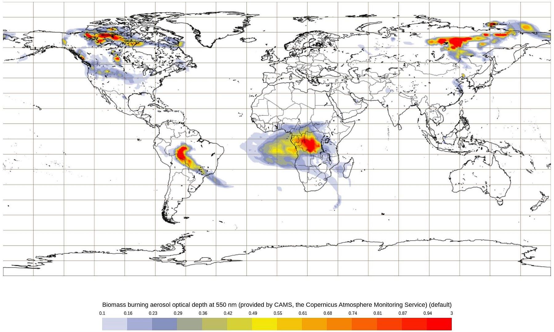 CAMS liefert täglich Fünf-Tages-Prognosen zur Zusammensetzung der Atmosphäre, einschließlich einiger Bestandteile, die besonders nützlich sind, um die Auswirkungen von Wildfeuer und Rauch auf die Atmosphäre zu verfolgen. Zwei der nützlichsten sind Aerosole und Kohlenmonoxid (CO), das bei unvollständiger Verbrennung, einschließlich bei Vegetationsbränden, entsteht und aufgrund seiner atmosphärischen Lebensdauer von einigen Wochen ein guter Indikator für den Ferntransport von Rauchverschmutzung ist. Bei Aerosolen ist es deren Aerosol Optische Dicke (AOD), die die Lichtabschwächung durch Partikel im Brandrauch angibt. Die operativen Vorhersagen von CAMS sind weltweit mit einer effektiven horizontalen Auflösung von etwa 0,4 Grad verfügbar. Darüber hinaus haben die regionalen Vorhersagen von CAMS eine horizontale Auflösung von 0,1 Grad, und die CAMS-Reanalyse der globalen Zusammensetzung der Atmosphäre ist mit einer horizontalen Auflösung von etwa 0,8 Grad von 2003 bis heute verfügbar.