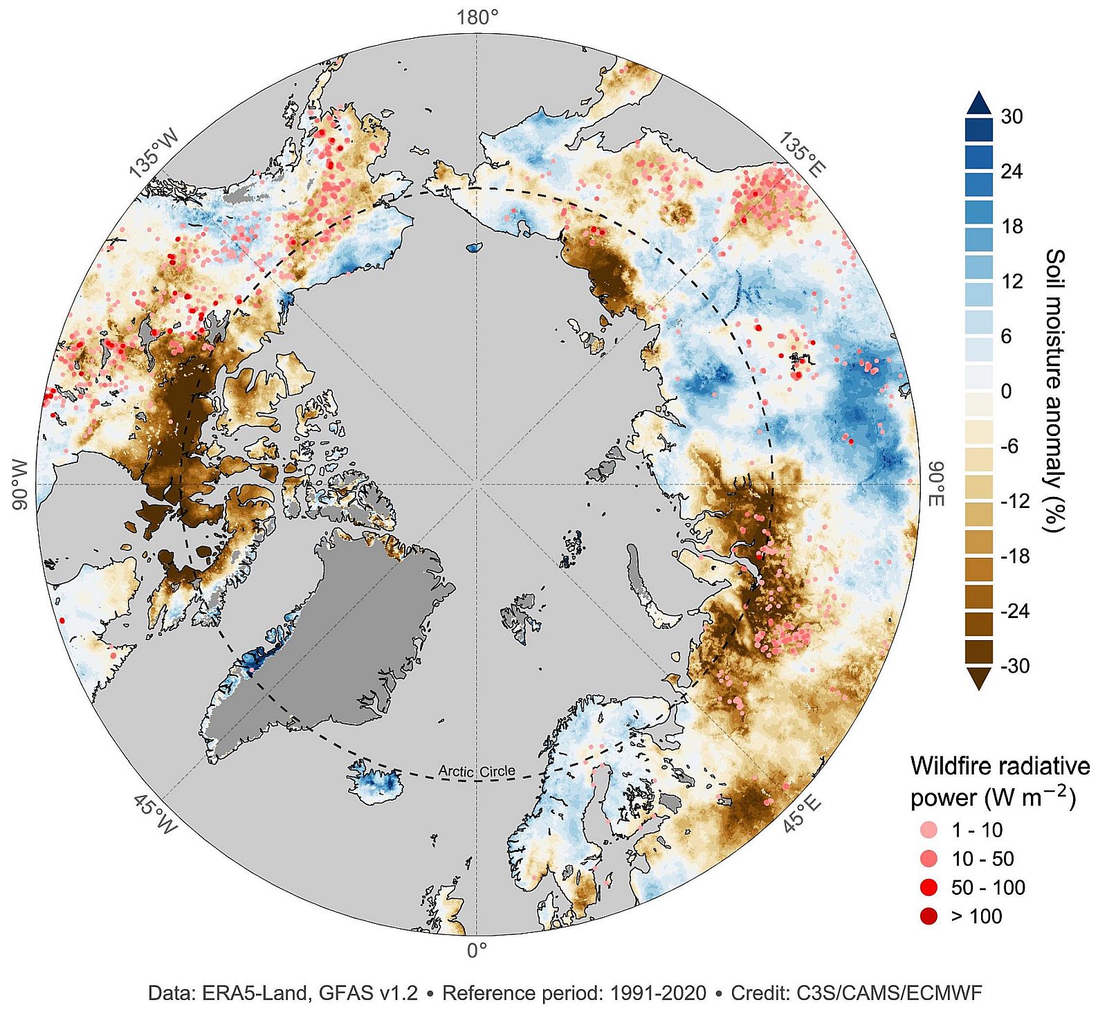 Die folgende Karte zeigt Anomalien der Bodenfeuchte sowie Brandgebiete mit vom GFAS geschätzter Strahlungsleistung von Wildfeuern größer oder gleich 1 W m-2 im Zeitraum Juni bis August 2022. Der Polarkreis ist durch eine gestrichelte Linie gekennzeichnet. Die rot schattierten Punkte stellen die gesamte Strahlungsleistung (FRP) der Waldbrände dar. Die Anomalien werden als Prozentsatz des Durchschnitts für den Referenzzeitraum 1991–2020 berechnet. Datenquellen: ERA5-Land-Bodenfeuchte und CAMS GFAS v1.2-Waldbranddaten.