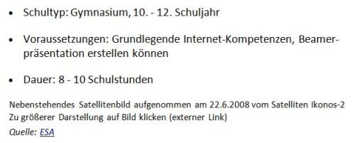 Sowohl im Fach Geographie als auch im Alltag begegnen uns immer häufiger Fernerkundungsbilder und die daraus gewonnenen Erkenntnisse. Aufgrund eigener Recherchen auf dem Internet und dem damit zunehmenden eigenen Wissen entwickelten die Autoren die Idee, den Schülerinnen und Schülern ähnliche Erfahrungen zu ermöglichen, nämlich des entdeckenden Lernens. Erfahrungen selbst gesteuerten Lernens dürfte in unserer Informationsgesellschaft in Zukunft immer mehr an Bedeutung gewinnen. Nicht das eigene, profunde Fachwissen der Lehrpersonen war entscheidend für den Erfolg, sondern das Vorbereiten von Richtlinien und Leitplanken im fast uferlosen Informationsozean und als Berater bei Strategiefragen und in Bezug auf Präsentationstechnik.